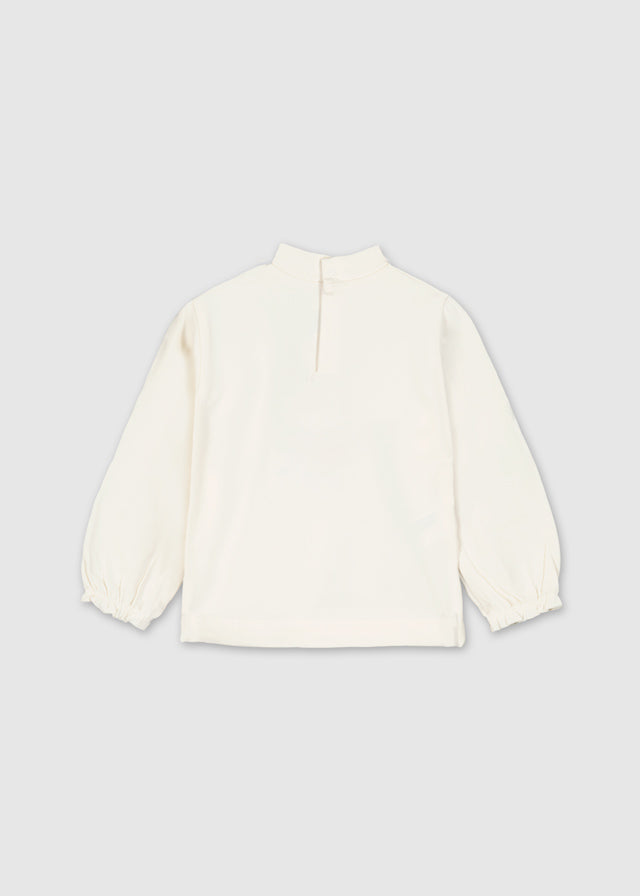 Camiseta de manga larga para bebé con puños elásticos. Cuello semicisne. Cierre con botones a presión en la parte posterior. Suave tejido de algodón elástico. Elementos de adorno: serigrafía (print).Color crudo.