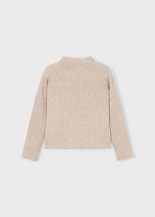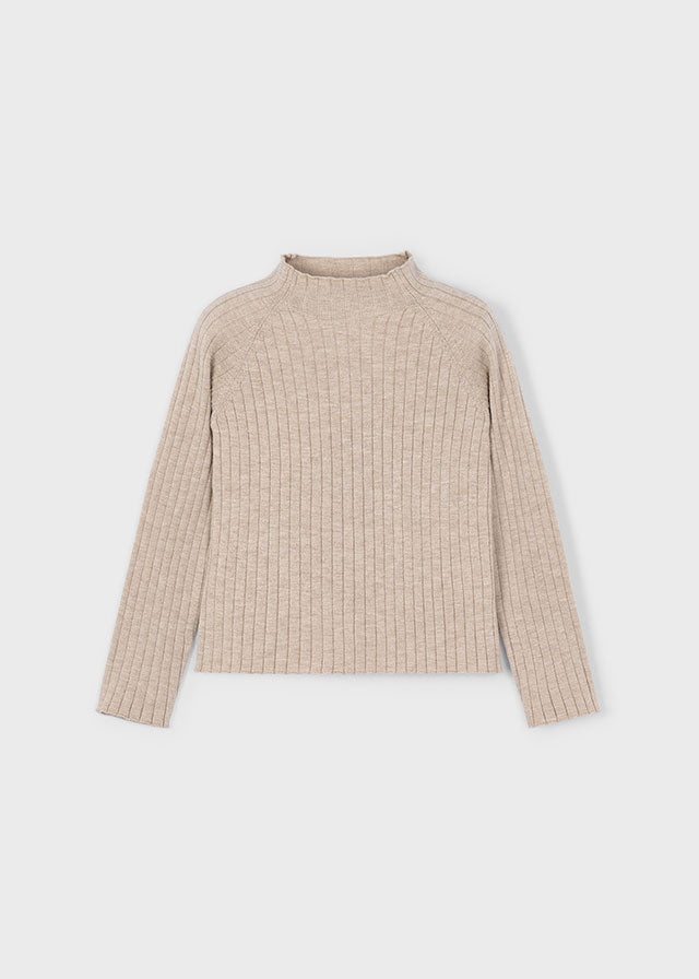 Camiseta de manga larga para niña. Cuello semicisne. Tejido de punto canalé. Elementos de adorno: detalles de ondas.Color tostado.