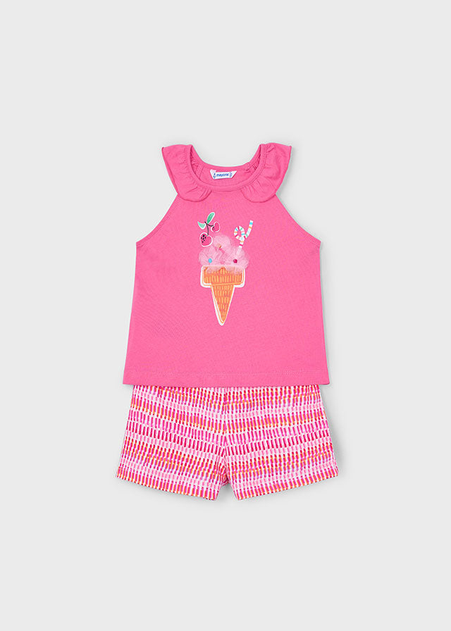 Conjunto algodón 2 piezas, pantalón multicolor y camiseta rosa.