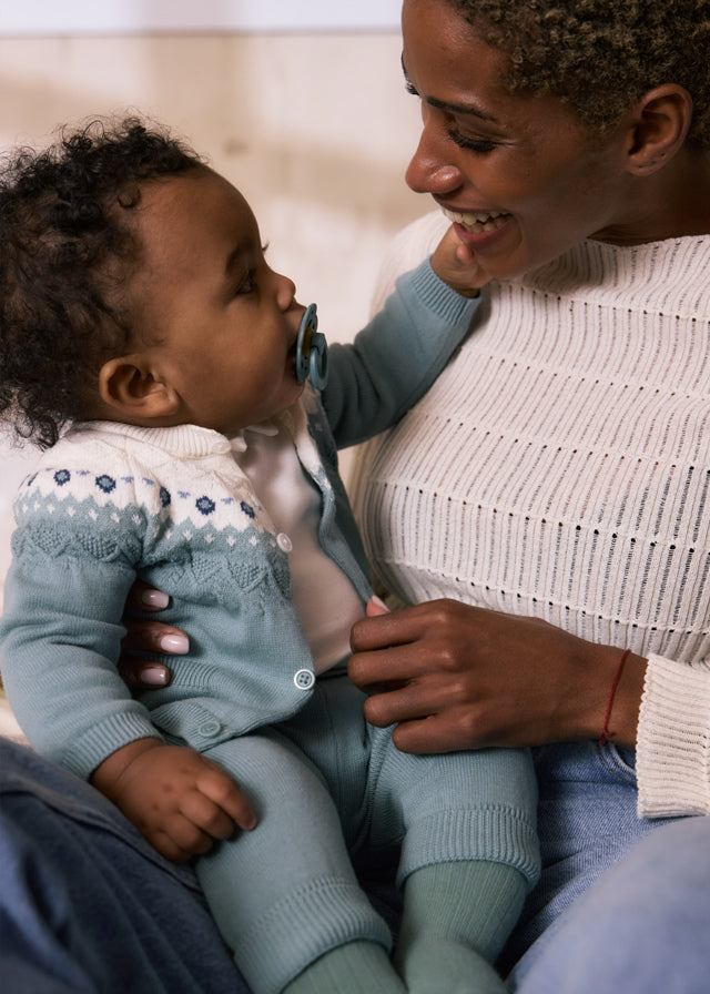 Chaqueta de tipo cardigan de manga larga para recién nacido. Cuello redondo. Cierre con botones en la parte delantera. Tejido de punto tricotosa de tacto suave y agradable. Elementos de adorno: bolsillo decorativo.