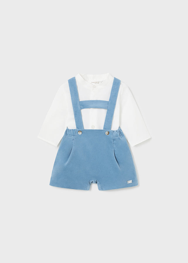 Conjunto de dos piezas de peto en tono azul y body blanco con cuello camisero.