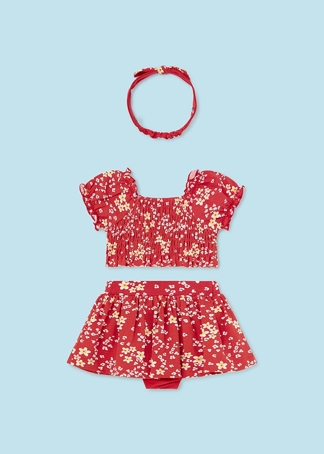Conjunto falda con braguita y blusa estampada en rojo, diadema a juego.