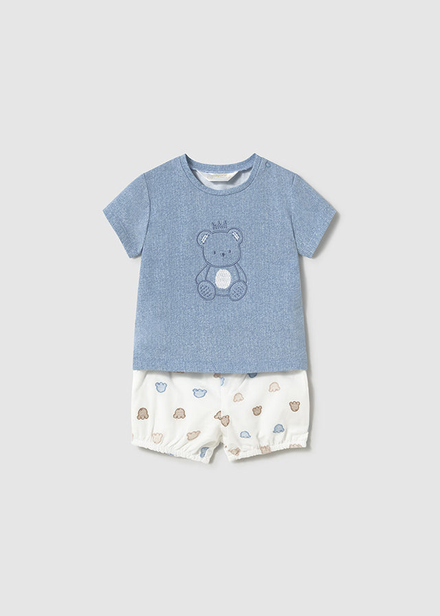Conjunto pantalón corto bombacho y camiseta color azul.