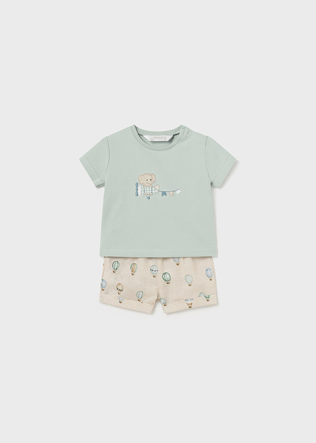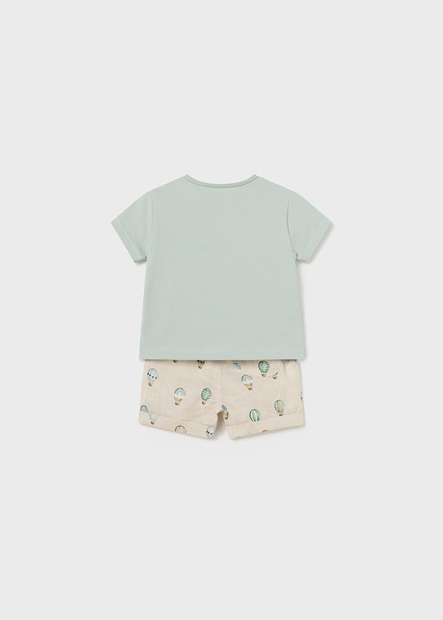 Este conjunto para bebé es una excelente opción para el verano. Con su camiseta y pantalón corto de algodón, tu pequeño estará cómodo y fresco en los días de calor. En color verde y beig.