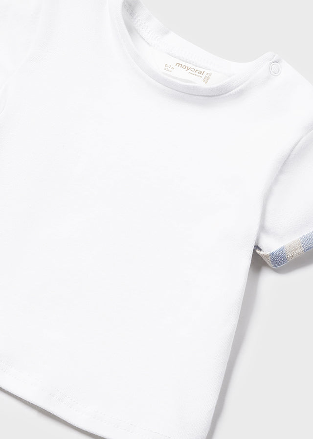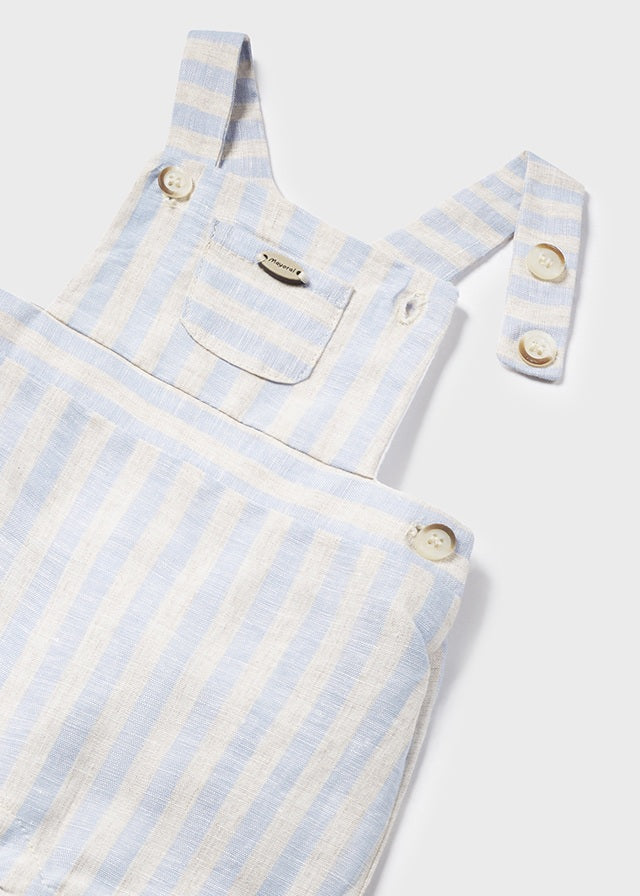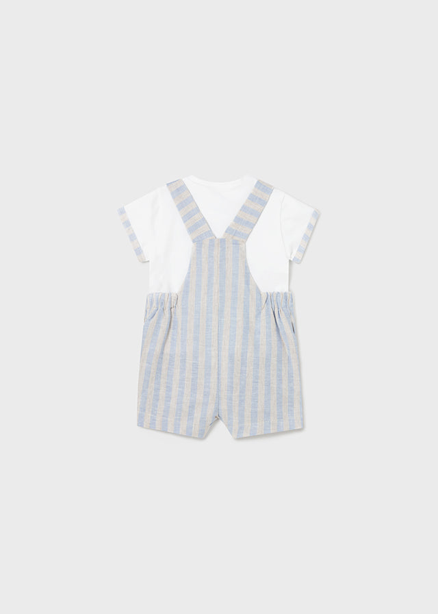 Conjunto de peto y camiseta para recien nacido, color beig y azul.