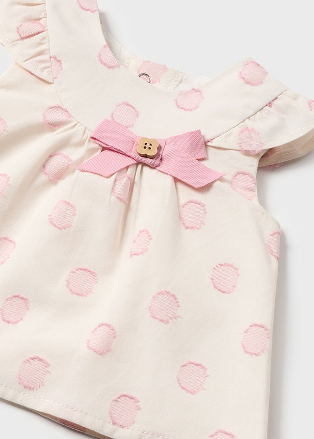 Pantalón short tipo braguita y camiseta de manga corta para recién nacido con detalles de volantes. Cuello redondo. Cierre con botones a presión