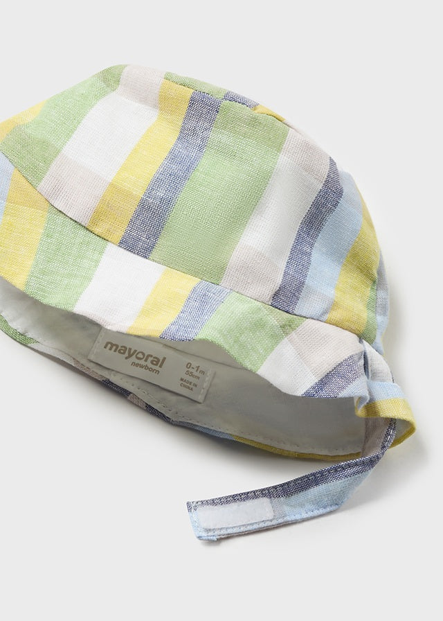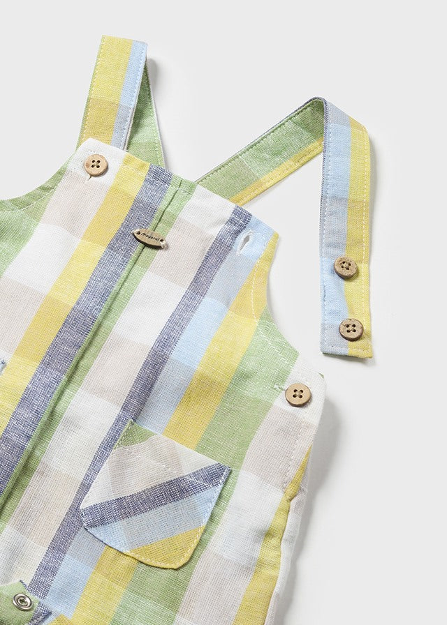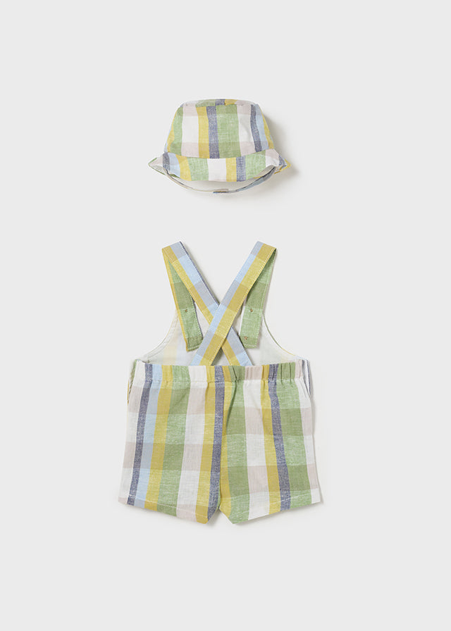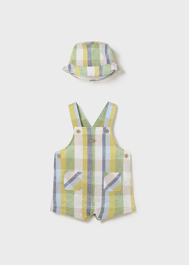 Este conjunto peto y gorro en tonos beigs,verde y azul es perfecto para bebés en verano. Ideal para recién nacidos, mantendrá a tu bebé fresco y cómodo durante todo el día.