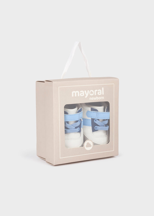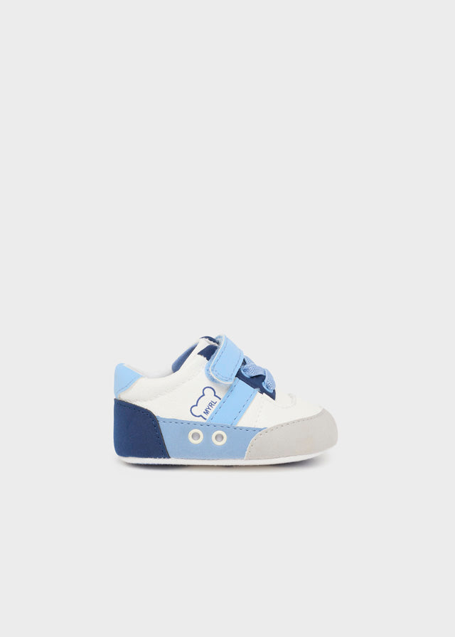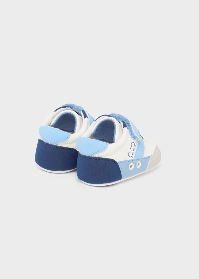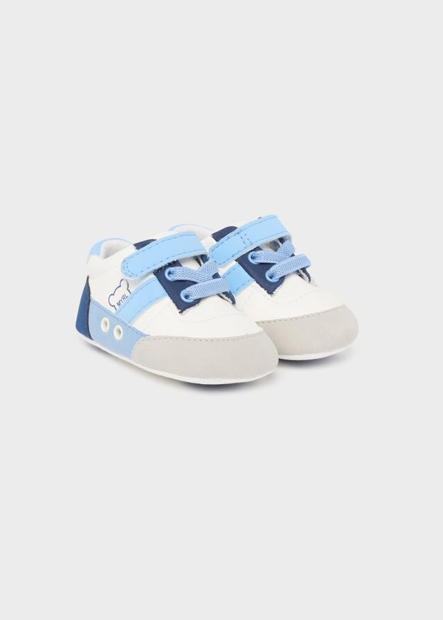 Deportivas en tonos pastel gris, celeste y blanco.