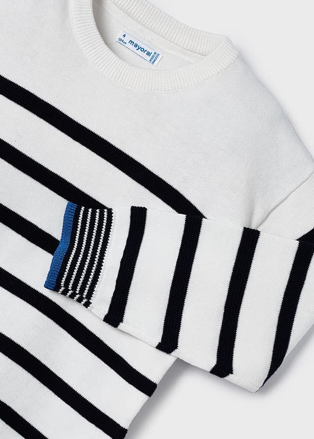 Jersey blanco rayas azul marino.