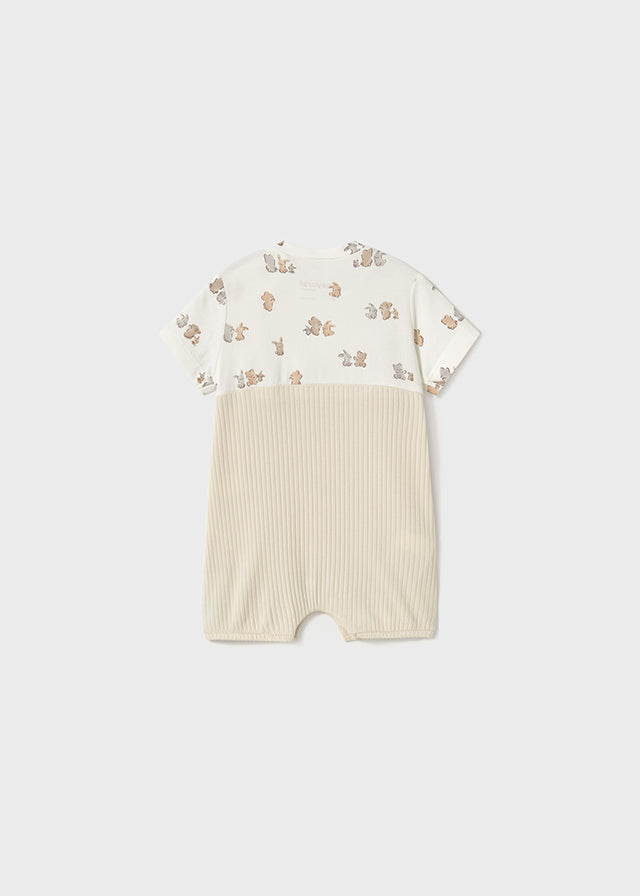 Pelele de manga corta para recién nacido. Diseño con peto simulado en superposición. Cuello cruzado y abertura lateral completa que cierra con botones a presión.Color beig.