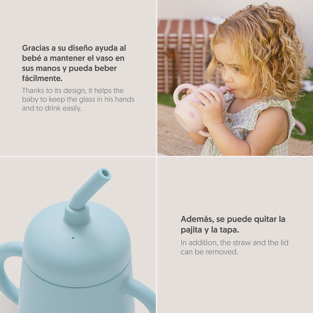 Vaso antigoteo que incuye pajita para ayudar a tu bebé a una mejor absorción de lÍquidos y evitar derrames. Ayuda a tu bebé a mantener el vaso en sus manos facilitándole la ingesta de lÍquidos. Pajita y tapita desmontables. Apto para lavavajillas.