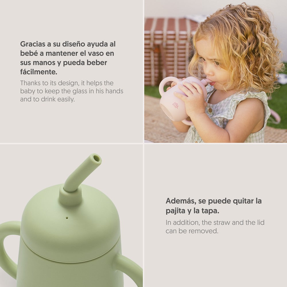 Vaso antigoteo que incuye pajita para ayudar a tu bebé a una mejor absorción de lÍquidos y evitar derrames. Ayuda a tu bebé a mantener el vaso en sus manos facilitándole la ingesta de lÍquidos. Pajita y tapita desmontables. Apto para lavavajillas.